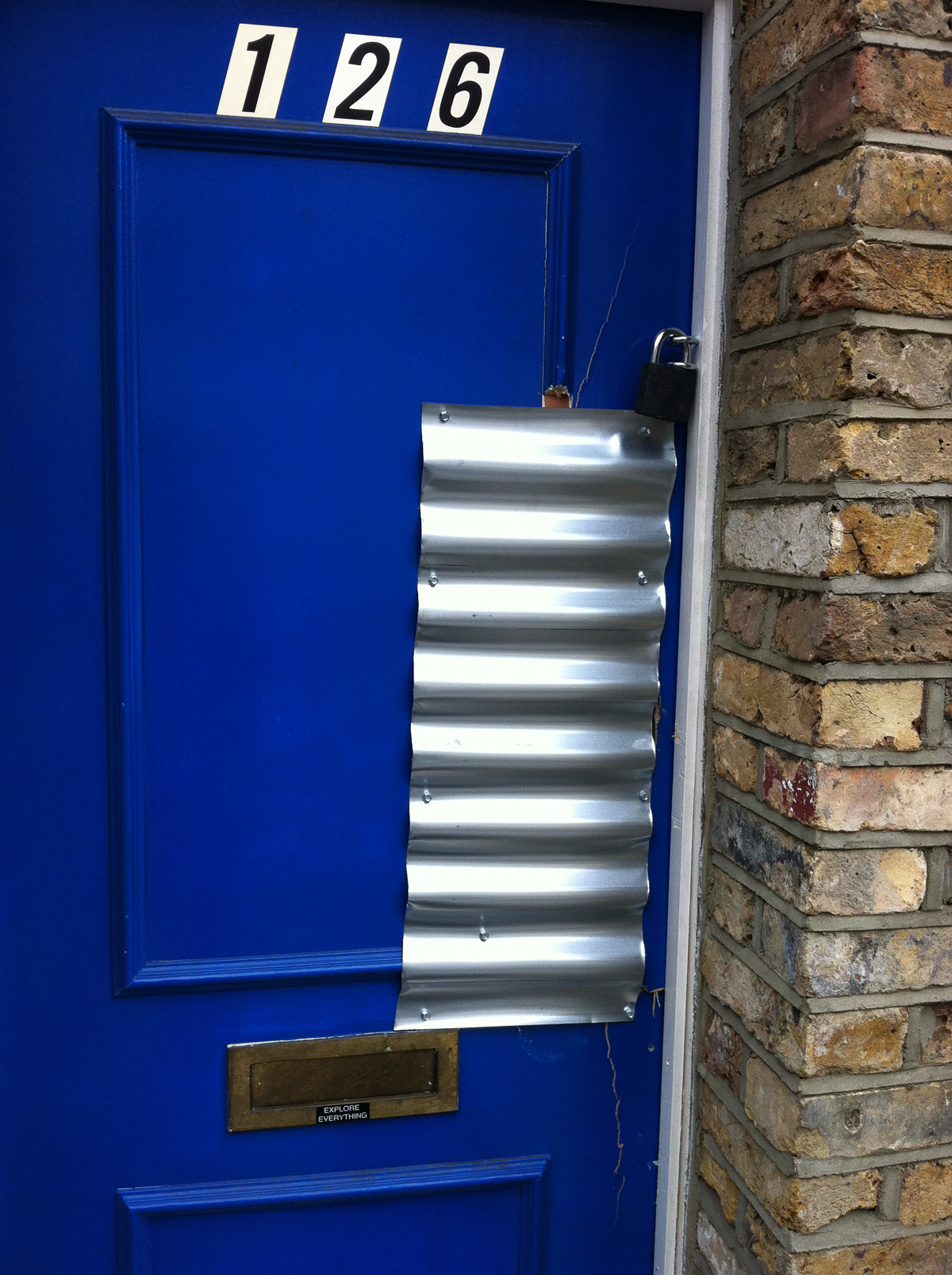 I was supposed to meet Matt at Heathrow Airport on the 17th August 2012 – he was flying from New York and I was flying from Cambodia, landing times synced. But I never showed. My plane was halted on the tarmac and I was arrested by British Transport Police, who had read my PhD thesis and wanted access to my research materials. Matt waited three hours for me before deciding he had been burned and took a cab to my flat, furious and frustrated. When he arrived, he took this photo of my door which had been smashed down by a police battering ram while I was in a holding cell.